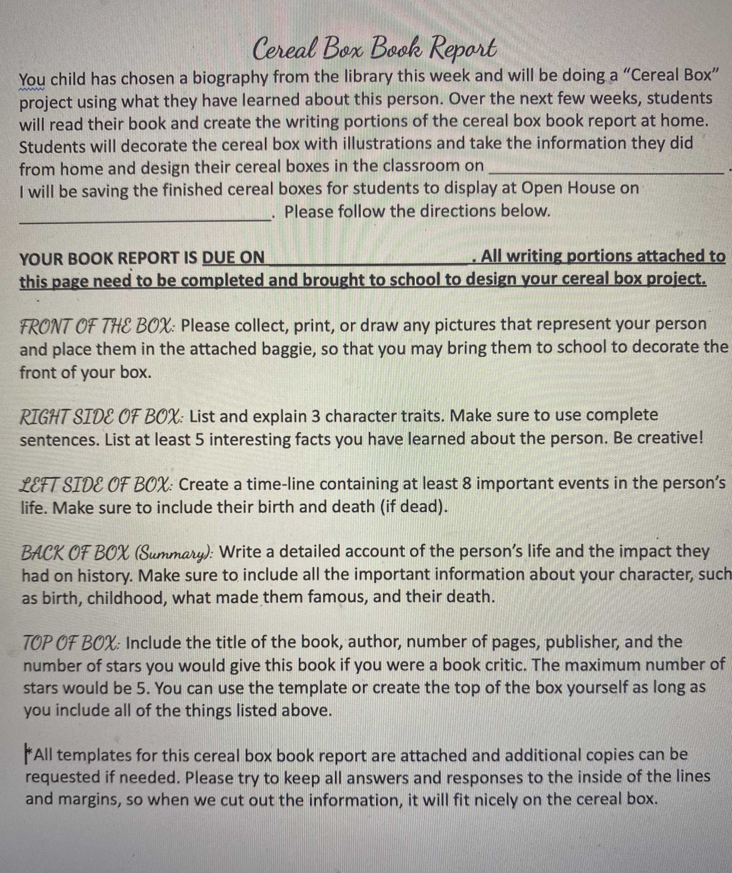 The Cereal Box Biography Book Report Project includes a front page with directions and two additional pages. One page is a set of graphic organizers that fit the sides and top of the box (story elements, facts, and a timeline). The second page is a whole page lined for a summary that fits on the back of the cereal box. Please see the Teacher Advice/Ideas Tab to see more pictures.